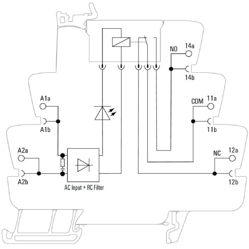 1 CO contact Contact material: AgNi 5µm Au Unique multi-voltage input from 24 to 230 V UC Input voltages from 5 V DC to 230 V UC with coloured marking: AC: red, DC: blue, UC: white