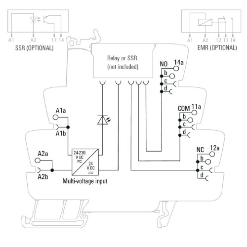 TERMSERIES empty sockets with: 1 CO contact Unique multi-voltage input from 24 to 230 V UC Input voltages from 5 V DC to 230 V UC with coloured marking: AC: red, DC: blue, UC: white Due to high-quality design and no sharp edges no risk of injuries during installation Partition plates for optical separation and reinforcement of insulation