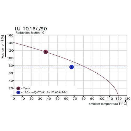 This PCB terminal provides connections for 76 A and 16 mm² conductor cross-section with proven clamping yoke connection at 10.16 mm pitch, conductor outlet direction in 90° design.