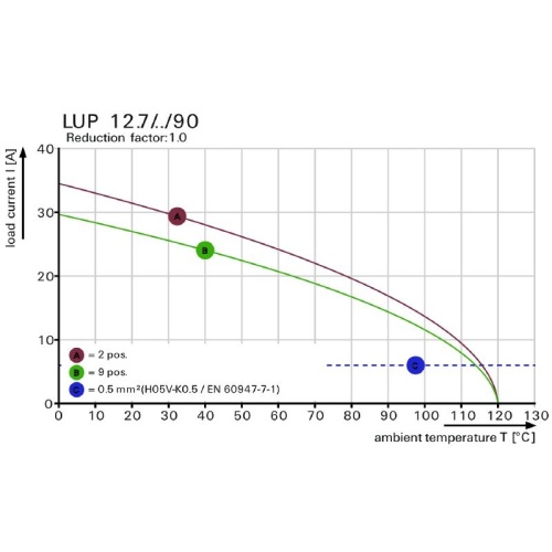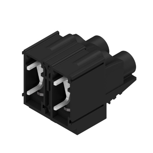 This PCB terminal provides connections for 1000 V, 76 A and 16 mm² conductor cross-section with proven clamping yoke connection at 12.7 mm pitch, conductor outlet direction in 90° design.