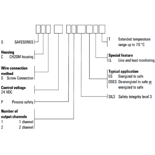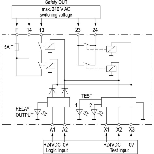 TUV certified and with "Approved Safety Function" Designed for "energized to safe" and "de-energized to safe" functions All-pole switch-off possible Test inputs for testing the relay contacts Externally accessible fuse
