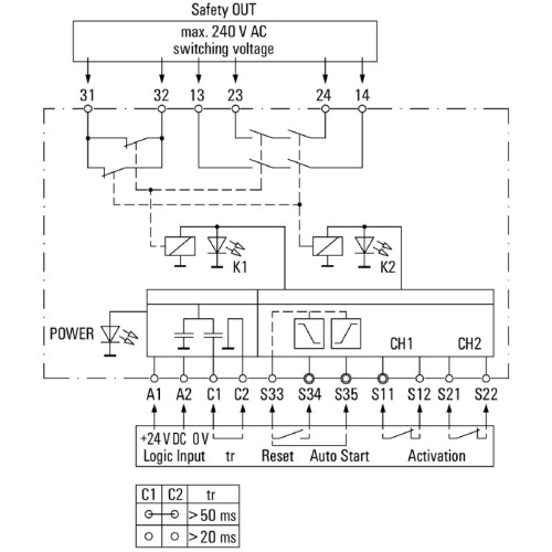 TUV certified "Approved Safety Function" Forcibly guided contacts according to EN 61810-3 Type B 2-channel design suitable for protection of human and machine Can be used for electrical equipment of combustion plants according to EN 50156