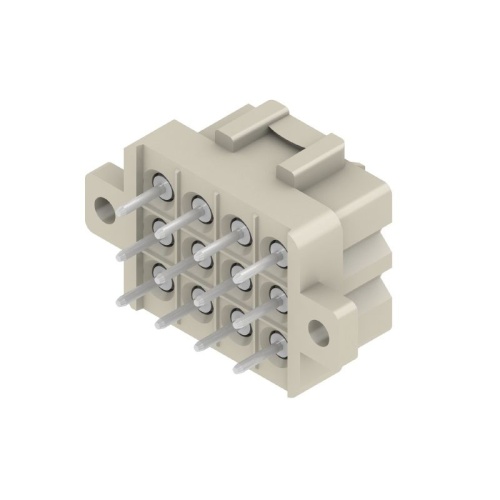 Rectangular plug-in male and female connector with solder contacts for PCB applications.