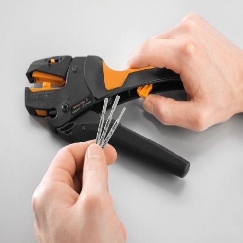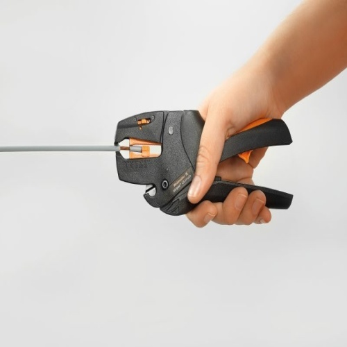 Stripping tools with automatic self-adjustment For flexible and solid conductors Ideally suitable for mechanical and plant engineering, railway and rail traffic, wind energy, robot technology, explosion protection as well as marine, offshore and ship building sectors Stripping length adjustable via end stop Automatic opening of clamping jaws after stripping No fanning-out of individual conductors Adjustable to diverse insulation thicknesses Double-insulated cables in two process steps without special adjustment No play in self-adjusting cutting unit Long service life Optimised ergonomic design