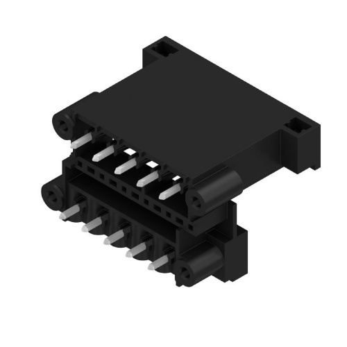 High-temperature resistant, double level, laterally offset, male connector with flange or solder flange. 1.5 mm solder pin is suitable for reflow soldering. 3.2 mm solder pin suitable for reflow and wave soldering.