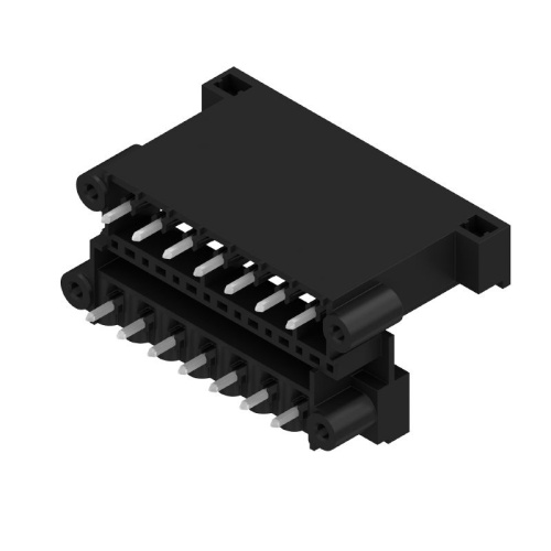High-temperature resistant, double level, laterally offset, male connector with flange or solder flange. 1.5 mm solder pin is suitable for reflow soldering. 3.2 mm solder pin suitable for reflow and wave soldering.