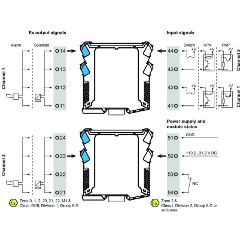 The ACT20X-SDI-HDO/2SDI-2HDO valve control modules are controlled from the safe zone on the input side by the switching signals (NPN, PNP) and provide digital outputs to switch actuators (solenoids, alarms) in Ex zone 0.