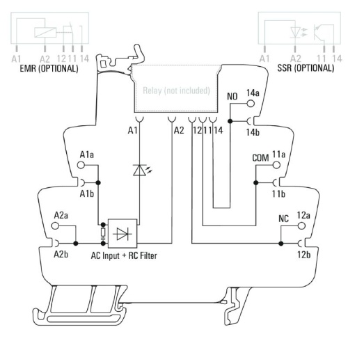 TERMSERIES empty sockets with: 1 CO contact Unique multi-voltage input from 24 to 230 V UC Input voltages with coloured marking: DC: blue, UC: white Due to high-quality design and no sharp edges no risk of injuries during installation Partition plates for optical separation and reinforcement of insulation
