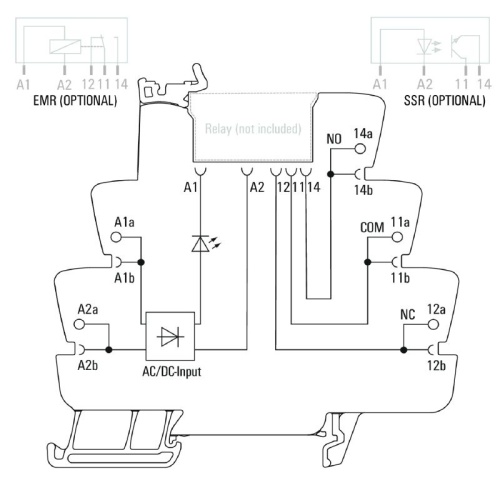 TERMSERIES empty sockets with: 1 CO contact Unique multi-voltage input from 24 to 230 V UC Input voltages with coloured marking: DC: blue, UC: white Due to high-quality design and no sharp edges no risk of injuries during installation Partition plates for optical separation and reinforcement of insulation