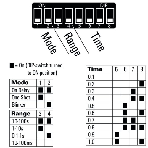 The timing functions and time ranges can be conveniently adjusted via the DIP switches on the side.