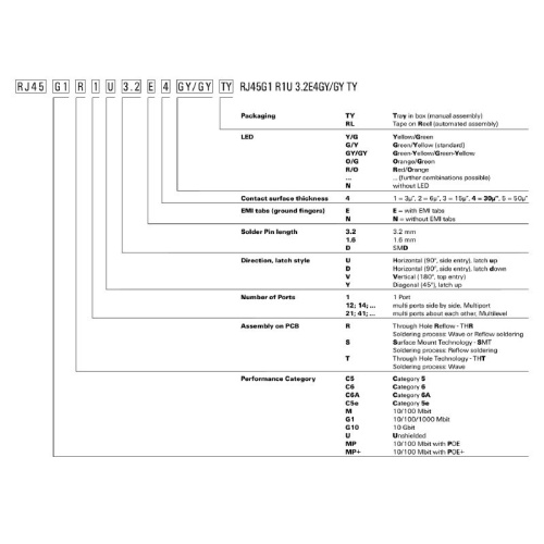 The product range encompasses the following designs: • 90°, lying (horizontal) and 180°, standing (vertical) • latch up / latch down • THT, THR or SMD soldering processes • Wide range of different design types, also with integrated LEDs and shield contact tabs • Transmission rates of up to 1 Gbps • Packed either in a tray (TY) or on a roll (tape-on-reel, RL) • Compatible with modular RJ45 connector according to ANSI / TIA-1096-A and IEC 60603 • Dielectric strength ≥1500 V AC RMS (2250 V AC peak value) according to IEEE 802.3 • Dielectric strength ≥1500 V AC (peak value) or ≥1500 V DC according to IEC 60603 • Compliance with IEEE 802.3 requirements (1000Base-T, 1 Gbps, IEEE 802.3ab or 100Base-Tx, 100 Mbps, IEEE 802.3u) Properties and advantages: • Extended temperature range of –40 °C to +85 °C for maximum performance • Reinforced gold layer (30µ") for improved corrosion protection • At least 0.3mm stand-off ensures a perfect soldering result