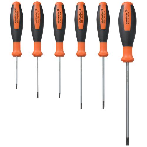 Weidmüller SoftFinish screwdriver for general uses, blade made from fully hardened, high-alloy chromium-vanadium-molybdenum steel, matt chrome finish.