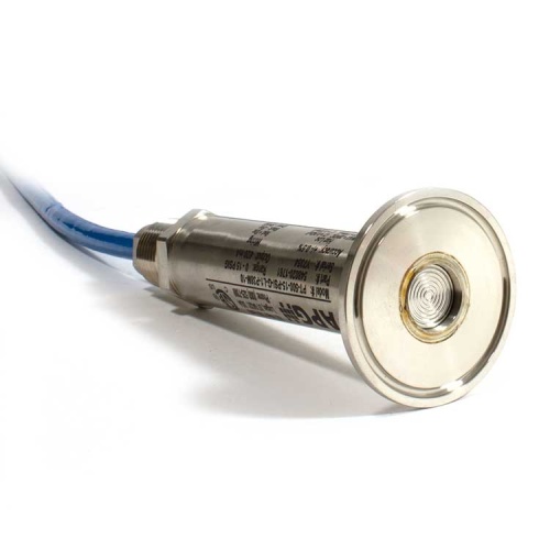 APG PT-500-C-5-PSI-G-L1-E0-P39-40-N0 Submersible Level Transmitter for dirty liquids with built in surge and lightning protection. 40' PVC cable with range of up to 450' at 0-5 PSI and an accuracy of ≤ 0.25% of span (BFSL). Output of 4-20 mA 2-wire (Loop Powered) with supply voltage of 9-28 VDC and 1/2" NPTM for conduit. Removable cage made 316 stainless steel with process connection of 1.5” tri-clover. Class 1 Div 1 Intrinsically Safe with 316 Stainless Steel housing. Temperature range of 0-130 F. Also available in 0-5,0-10,1-5 and 1-0 VDC or Modbus RTU outputs. Diameter is 3-1/2".