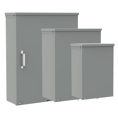 nVent Hoffman A10R84 Commercial Enclosure Screw-Cover Type 3R Steel Junction Box Enclosure with knockous Type 3R used in outdoor applications as a wiring junction box. Slip on removable cover with screws at bottom edge, drip shield top, padlocking provisions, no gasket, gray powder coat finish inside and out.