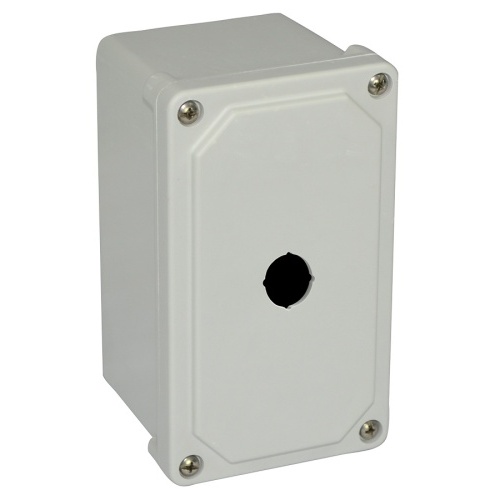 Allied Moulded AM1PB22 ULTRAGUARD Fiberglass reinforced polyester Type 4x Push Button Enclosure with 1 hole 22.5mm. 7" x 4" x 3" (HXWXD) Inside Dimension. Opaque cover with lift off 4 screw cover. 316 Stainless Steel external hardware and plated carbon steel internal hardware.