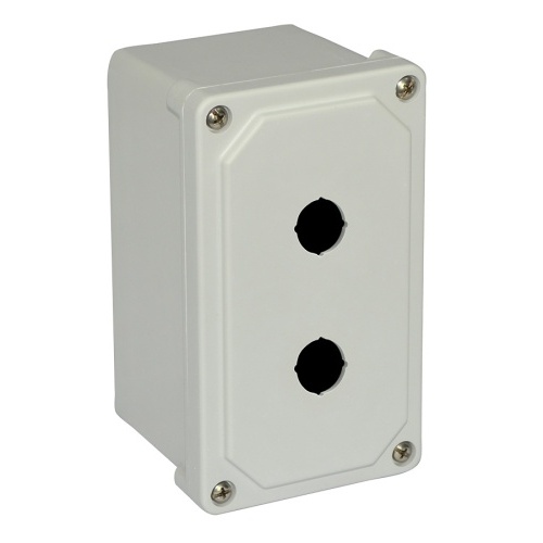 Allied Moulded AM2PB22 ULTRAGUARD Fiberglass reinforced polyester Type 4x Push Button Enclosure with 2 holes 22.5mm. 7" x 4" x 3" (HXWXD) Inside Dimension. Opaque cover with lift off 4 screw cover. 316 Stainless Steel external hardware and plated carbon steel internal hardware.