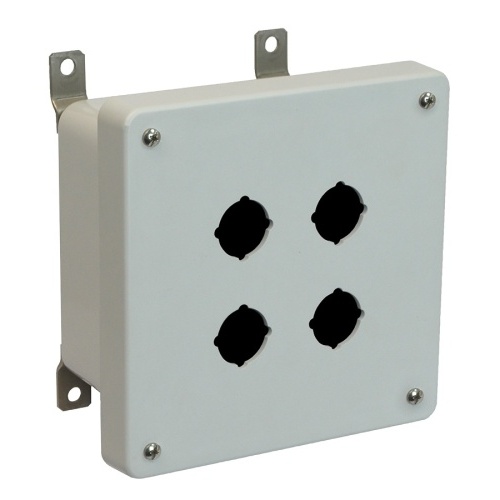 Allied Moulded AM664P4 ULTRAGUARD Fiberglass reinforced polyester Type 4x Push Button Enclosure with 4 holes 30.5mm. 6" x 6" x 4" (HXWXD) Inside Dimension. Opaque cover with lift off 4 screw cover. 316 Stainless Steel external hardware and plated carbon steel internal hardware.
