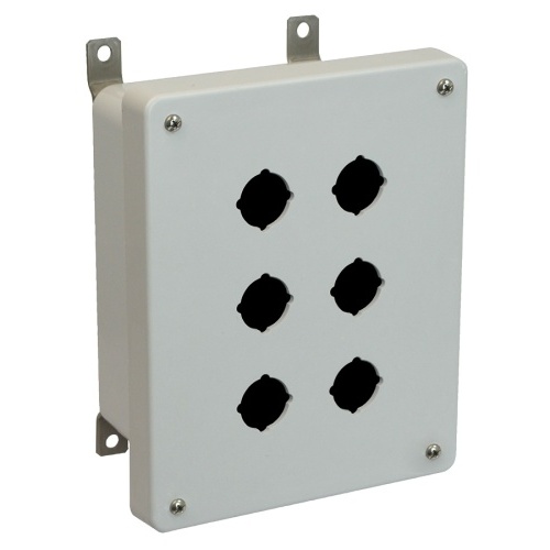 Allied Moulded AM864P6 ULTRAGUARD Fiberglass reinforced polyester Type 4x Push Button Enclosure with 6 holes 30.5mm. 8" x 6" x 4" (HXWXD) Inside Dimension. Opaque cover with lift off 4 screw cover. 316 Stainless Steel external hardware and plated carbon steel internal hardware.