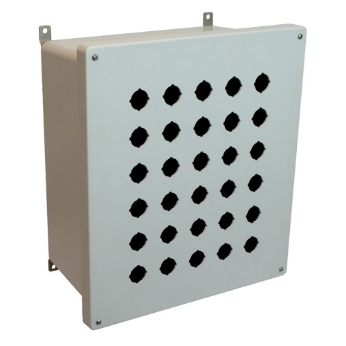 Allied Moulded AM1648P30 ULTRAGUARD Fiberglass reinforced polyester Type 4x Push Button Enclosure with 30 holes 30.5mm. 16" x 14" x 8" (HXWXD) Inside Dimension. Opaque cover with lift off 4 screw cover. 316 Stainless Steel external hardware and plated carbon steel internal hardware.