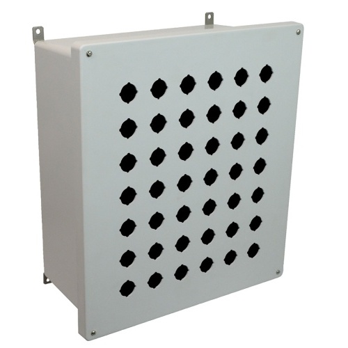 Allied Moulded AM1868P42 ULTRAGUARD Fiberglass reinforced polyester Type 4x Push Button Enclosure with 42 holes 30.5mm. 18" x 16" x 8" (HXWXD) Inside Dimension. Opaque cover with lift off 4 screw cover. 316 Stainless Steel external hardware and plated carbon steel internal hardware.