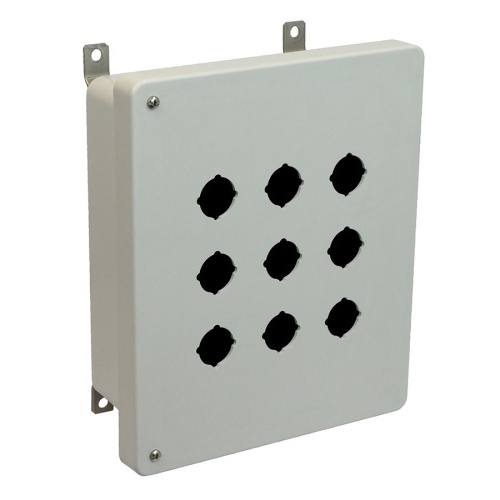 Allied Moulded AM1084HP9 ULTRAGUARD Fiberglass reinforced polyester Type 4x Push Button Enclosure with 9 holes 30.5mm. 10" x 8" x 4" (HXWXD) Inside Dimension. Opaque cover with two screw hinged cover. 316 Stainless Steel hinge, external hardware and plated carbon steel internal hardware.