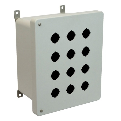 Allied Moulded AM1086HP12 ULTRAGUARD Fiberglass reinforced polyester Type 4x Push Button Enclosure with 12 holes 30.5mm. 10" x 8" x 6" (HXWXD) Inside Dimension. Opaque cover with two screw hinged cover. 316 Stainless Steel hinge, external hardware and plated carbon steel internal hardware.