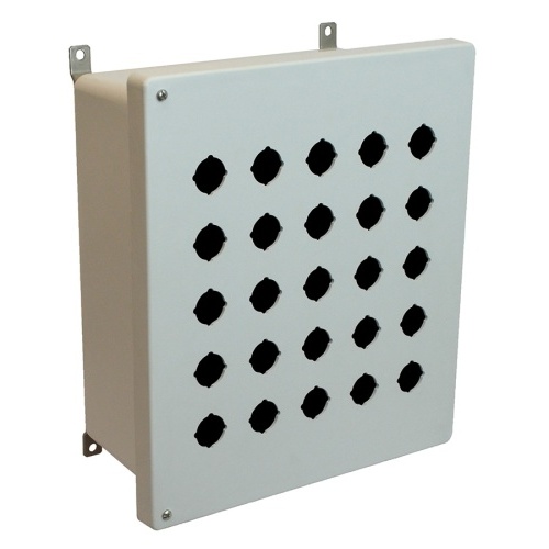 Allied Moulded AM1426HP25 ULTRAGUARD Fiberglass reinforced polyester Type 4x Push Button Enclosure with 25 holes 30.5mm. 14" x 12" x 6" (HXWXD) Inside Dimension. Opaque cover with two screw hinged cover. 316 Stainless Steel hinge, external hardware and plated carbon steel internal hardware.
