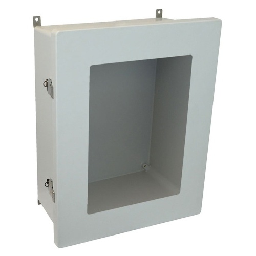 Allied Moulded AM2068LW ULTRAGUARD Fiberglass reinforced polyester Type 4x Window Junction Box Enclosure 20" x 16" x 8" (HXWXD) Inside Dimension. Bonded clear polycarbonate cover hinged with lockable clamp latch. 316 Stainless Steel hinge, latch, external hardware and plated carbon steel internal hardware.