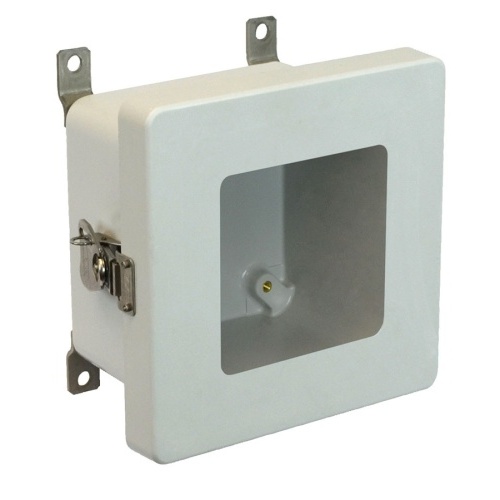 Allied Moulded AM664TW ULTRAGUARD Fiberglass reinforced polyester Type 4x Small Window Junction Box hinged with lockable twist latch, non-corrosive and non-conductive is lightweight and easy to modify. Ideal to protect electronic and electrical components, controls and instruments in outdoor and indoor applications. Rigid design compression molded SMC box and Cover ideal for extreme temperature and corrosive environments.