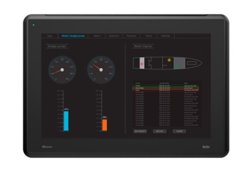Beijer 640002405 X2 control 15 Graphic, resistive touch, aluminum, panel mount, operator terminal. 1280x800 pixels (16:9), LED backlit 15.4" TFT-LCD color display, 450 cd/m² industrial dimmable, 1 GHz quad Cortex-A9 CPU, 2 GB NVRAM, 2 GB MLC NAND flash, 2x Ethernet, 1x3 serial ports, 2x USB 2.0, 1x SD, 24 VDC power supply, -10 to 60 C operating temperature, IP65, CE, FCC, KCC, NEMA 4x/12, UL Type 4x/12 approvals plus DNV, KR, GL, LR, ABS, CCS marine approvals. Includes iX Runtime and Codesys runtime EtherCAT/ModbusTCP & RTU. WEC2013 Professional. Beijer-branded.