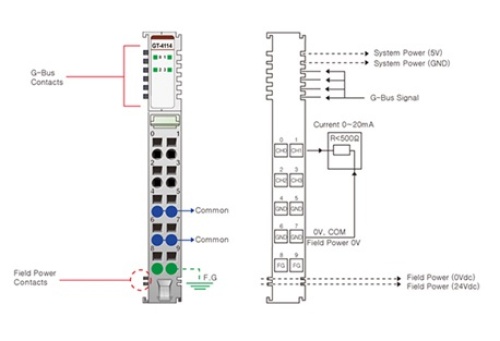GT-4114 - 4 analog output, 0~20mA, 12bit resolution, cage clamp, 10pt removable terminal