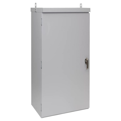 nVent Hoffman A72R7224FSLP Weatherpro Steel Enclosure WeatherPro Outdoor Free-Stand Enclosure Type 3R Pad Mount, protect controls, power distribution components, drives, or contactors in outdoor control, commercial or industrial power and distribution applications. Hinged door with 3-point latching system and heavy duty handle which includes padlocking provisions. Drip edge overhang on top, louvered overhang with closure plate, open bottom woth pre-punched mounting hole flange, bonding provsions on doors, two door models have overlapping doors with no center post, and includes 7 gauge lifting tabs.