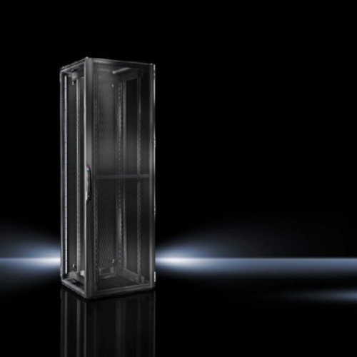 Rittal 9972001 - Includes: Enclosure frame TS 8 with doors and roof plate, Aluminum sheet steel door at the front, vented (vented surface area approx. 85% perforated), 180° hinges, Lock front and rear: Comfort handle for semi, cylinders and security lock 3524 E, Two 482.6 mm (19") mounting sections front and rear, variably mounted on support strips with quick, release fasteners, Spacers to raise the fan cover plate, for passive cooling (supplied loose), Connection accessories for potential equalization with earthing point (supplied loose), 50 multi, tooth screws M5, captive nuts M5, conductive (supplied loose), Roof plate, multi, piece, removable, with side cable entry in the depth and covered cut, out for fan mounting plate, Carbon steel door at rear, ventilated in one piece (free area in perforated sheet metal part approx. 85 %), 130° hinges