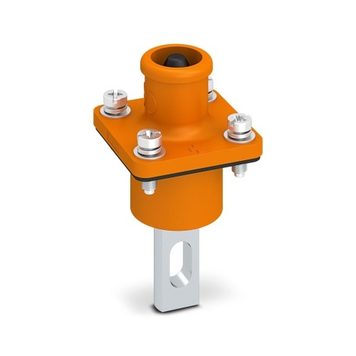Phoenix Contact 1155483 The connector has specific dimensions and specifications, including a range of articles (BPC), an orange color, one position, and conductor cross section sizes between 35 mm2 and 70 mm2. It is rated for 1500 volts and 250 amps, and features screw/solder connections with a pin-type contact.