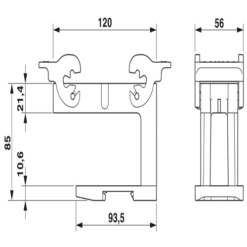 Phoenix Contact 1404212 A Heavycon din rail mounting frame consists of two parts - a lower section featuring a double locking latch, suitable for use with sleeve housings that do not have this feature. The upper part is designed specifically for type B24 contact inserts and is compatible with NS35/7.5 DIN rails.