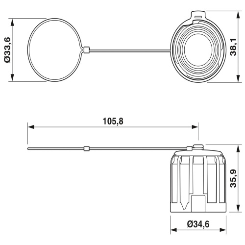 Phoenix Contact 1404525 A protective cap made of black plastic is designed to fit the QUICKON connection and features a retaining cord to secure it in place, providing an IP68 rating that safeguards against dust and water ingress.