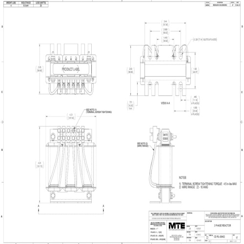 MTE RL-00402 Line & Load Reactor 480 Volt 3 Phase 1.5 or 2 Horsepower @ 3% Impedancewith open frame. Best in class rugged and robust line/load reactors with low watts loss. Highest continuous service factor with performance and durability unmatched by the competition.