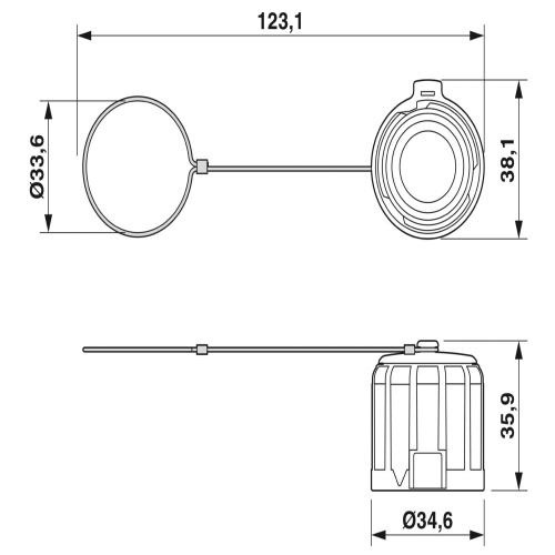 Phoenix Contact 1404526 A protective plastic cap featuring a QUICKON connection is available in gray and comes with a retaining cord, offering enhanced protection against dust and water ingress, as indicated by its IP68 rating.