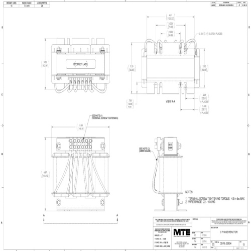 MTE RL-00804 Line & Load Reactor 480 Volt 3 Phase 3 Horsepower @ 5% Impedancewith open frame. Best in class rugged and robust line/load reactors with low watts loss. Highest continuous service factor with performance and durability unmatched by the competition.