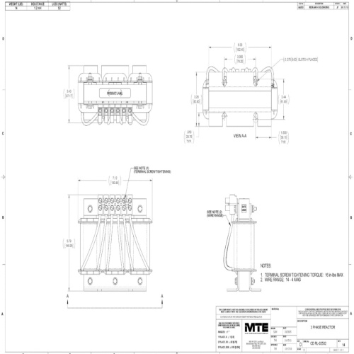 MTE RL-02502 Line & Load Reactor 480 Volt 3 Phase 15 Horsepower @ 3% Impedancewith open frame. Best in class rugged and robust line/load reactors with low watts loss. Highest continuous service factor with performance and durability unmatched by the competition.
