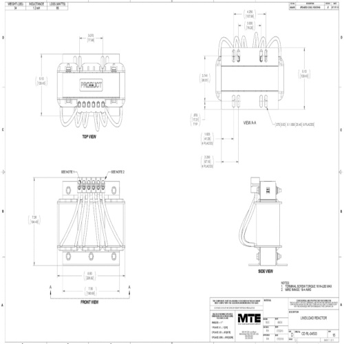 MTE RL-04503 Line & Load Reactor 480 Volt 3 Phase 30 Horsepower @ 5% Impedancewith open frame. Best in class rugged and robust line/load reactors with low watts loss. Highest continuous service factor with performance and durability unmatched by the competition.