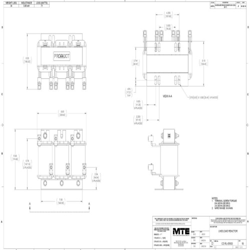 MTE RL-05503 Line & Load Reactor 480 Volt 3 Phase 40 Horsepower @ 5% Impedancewith open frame. Best in class rugged and robust line/load reactors with low watts loss. Highest continuous service factor with performance and durability unmatched by the competition.