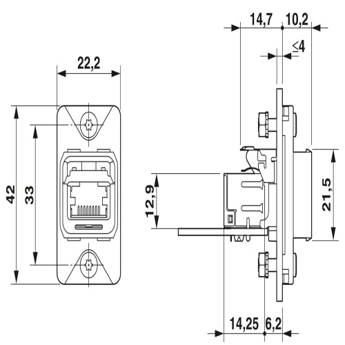 Phoenix Contact 1413963 A RJ45 panel mounting frame that provides a secure and dustproof installation, suitable for use in harsh environments, is available. The frame features an IP67 rating, ensuring protection against solid objects and water jets, while also providing a push-pull interlocking mechanism to prevent accidental disconnection. The metal construction ensures durability, and the square panel cutout accommodates standard RJ45 connectors, with additional grommets for cable management and mounting screws for secure fastening to a panel, ideal for PCB connection applications.