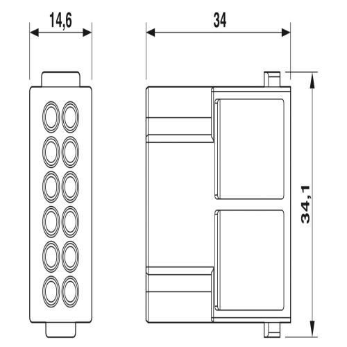 Phoenix Contact 1414354 The insert module has a total of 12 contact positions, including power and control contacts, which are connected using pin and crimp connections, rated for a current capacity of 10 Amps and having cross-sectional areas of 0.14 mm² to 2.5 mm², with the primary application being signal transmission.