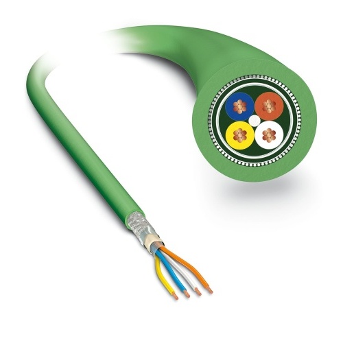 Phoenix Contact 1416389 A data cable with specifications including a PROFINET CAT5 and EtherCAT CAT5 connection, shielded with PVC/PVC insulation in green RAL 6018, featuring four wires of AWG22/7 gauge and SF/TQ twist, available in single colors such as white, yellow, blue, or orange, and comes in a length of 100 meters.
