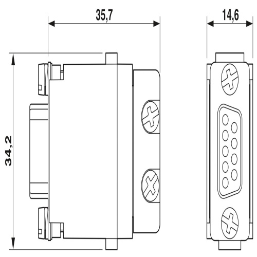 Phoenix Contact 1417308 The contact module has a connector with 9 pins of type D-SUB-9, featuring a socket that can be securely fastened through crimp connection, and is designed to operate at 48 volts and up to 1 ampere with an insulation thickness of either 0.08 or 0.5 mm2, making it suitable for data transmission without the need for additional crimp contacts.
