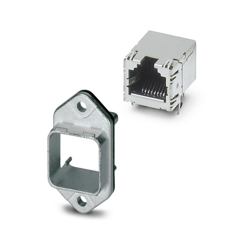 Phoenix Contact 1608029 A RJ45 panel mounting frame is available that features IP67 rating for protection against dust and water, allowing for push-pull interlocking mechanism. Made of metal, it has a square panel cutout and comes with a pre-installed grommet for cable management, eliminating the need for additional mounting screws to secure PCB connection.