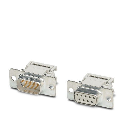 Phoenix Contact 1688816 The D-SUB contact insert has nine signal contacts, features a flat-ribbon cable connection and is attached to the panel using a 3mm hole in an angled position.