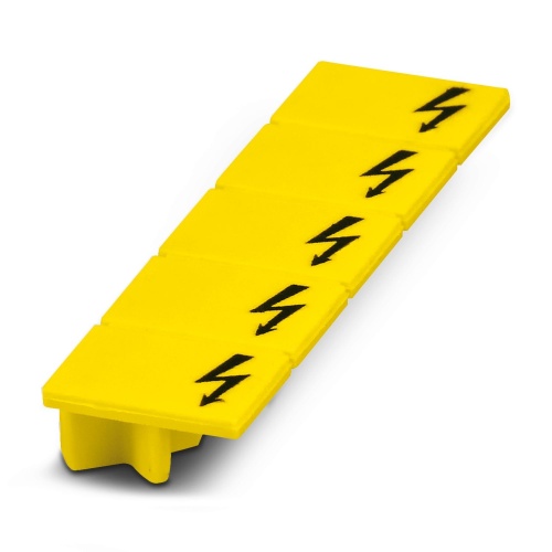 Phoenix Contact 3030967 The warning label indicates a strip with a specific warning message and is characterized by its bright yellow color and unique labeling pattern that distinguishes it from other similar strips. The strip features five individual labels, each bearing its own unique design elements, including a mounting type indicator that serves as an easy reference point for users to determine how the strip should be mounted.