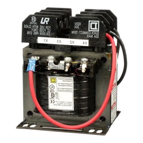 Square D 9070TF100D33 Class 9070 Type TF Transformer 100 VA Output (VoltAmp). 380/480/415 VAC to 115/230 VAC. 4.18" x 3.38" x 3.34" (HxWxD). Includes 2 primary fuse blocks and 1 secondary fuse block mounted on top of transformer. Includes rejection-style clips to increase the AIC ratings for the fuses. Low impedance windings for excellent voltage regulation. Accomodates high inrush currents from relays, starters, solenoids, contactors etc.